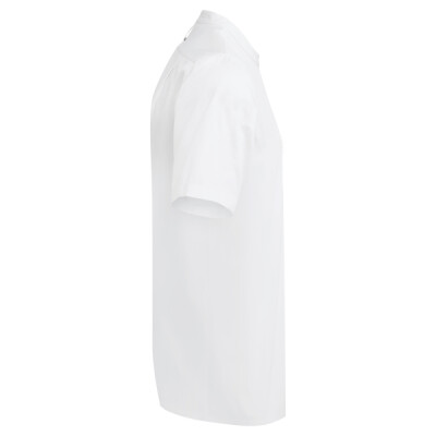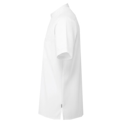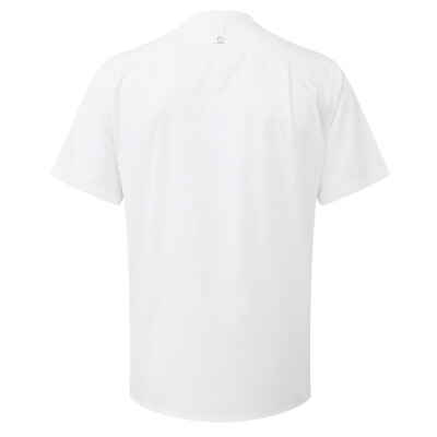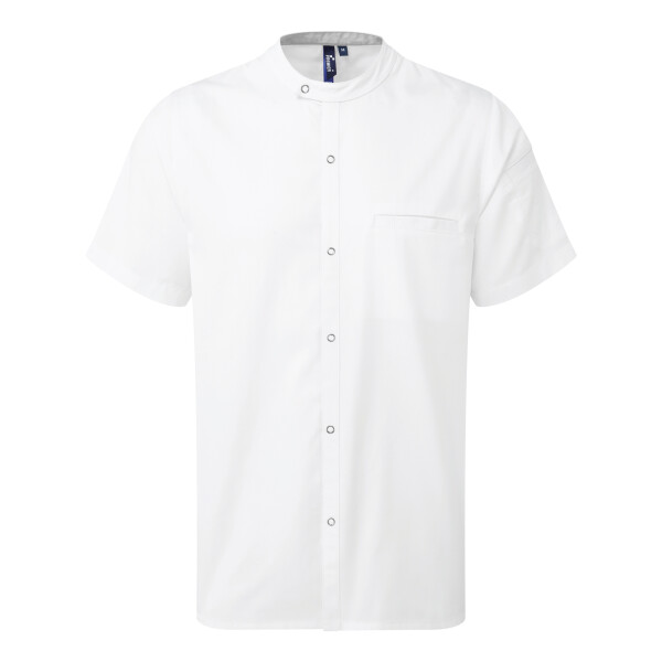 Lightweight short sleeve chef’s shirt made with certified recycled polyester. Mandarin banded collar and press stud closure. Contrast inner neckband. Two pen pockets on left arm. Welt pocket to front left chest with combined pen pocket and faux top stitching. Pocket bag can be moved to allow for embroidery. Back yoke with pleats for ease of movement through chest and shoulders. Press stud tab to the back for hanging or securing an apron in place. Reinforced side seams.