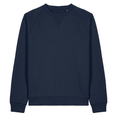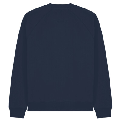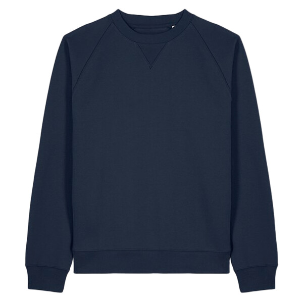Raglan sleeves. 1x1 ribs at collar, sleeves cuffs and bottom hem. 1x1 ribs v-notch at collar. 1x1 ribs side panels. Two-needle topstitches at the collar, sleeve cuffs and bottom hem. Three-needle flatlock stitches at the raglan seam, side panel seams and v-notch. Inside back neck tape in herringbone. Self-fabric half moon at back neck.