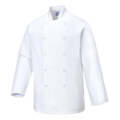 • The double-breasted front and rubber button features enhance the classic styling of this garment
